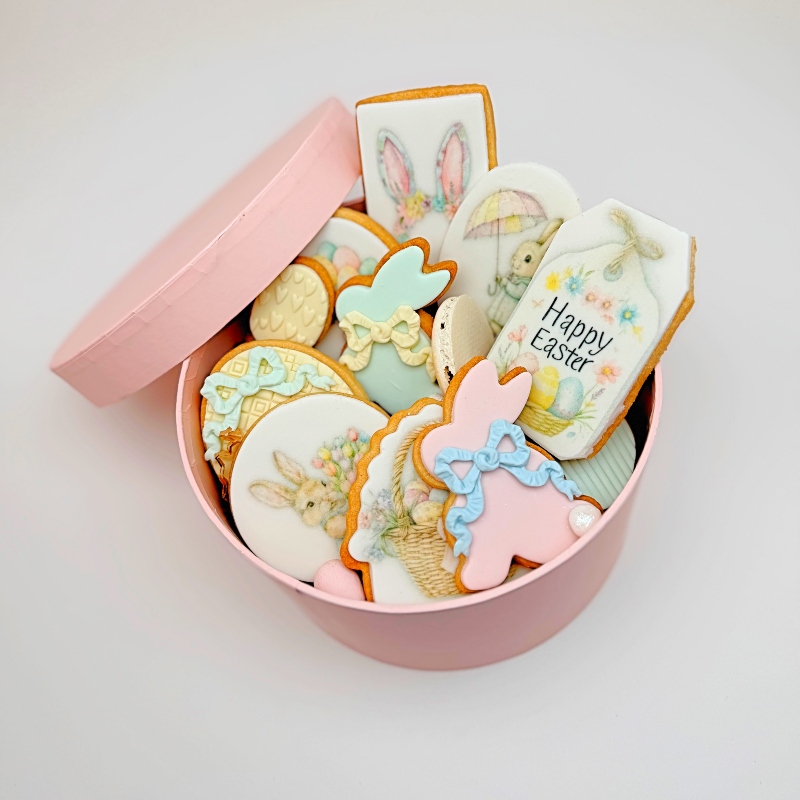 A stunning assortment of handcrafted and watercolor inspired treats, all beautifully decorated with Easter and springtime flair. Each box includes a delightful mix of printed sugar cookies, French macarons, cake truffles, alfajores, and strawberry-filled shortbread cookies.