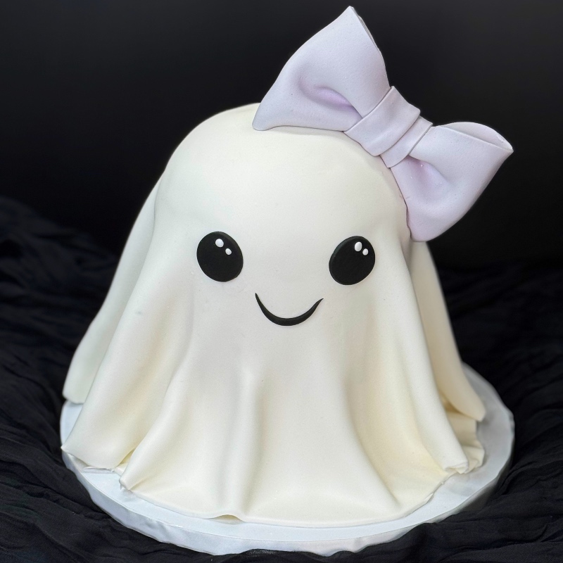 A whimsical centerpiece for the season, this enchanting ghost-themed cake is crafted with delicate fondant details and finished with our signature Swiss buttercream. Perfect for adding charm to any Halloween celebration, it is available in two sizes and can be customized in your choice of eight exquisite flavors.